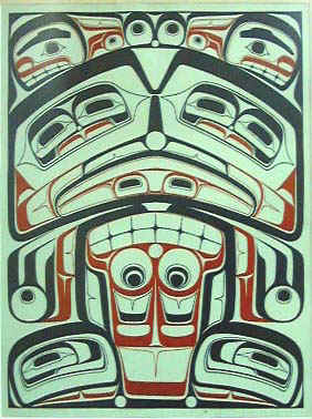 This print is the compainion of "Sea Bear Box Front". It is a design meant for a Bentwood Box. In each of these graphics the head is seenin the upper half,with the ears in the corners, the central part is the body, the hind legs occupy the lower corners, the front legs with paws or flippers are at each side. Condition: |