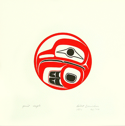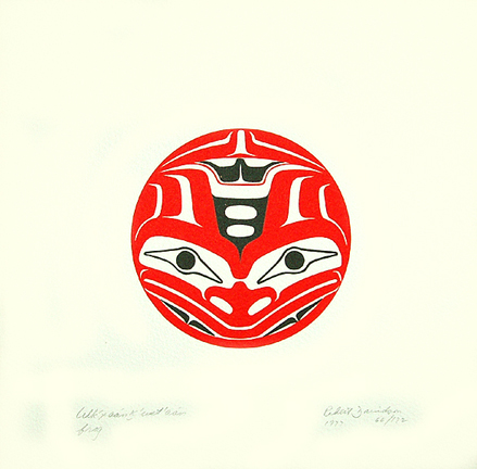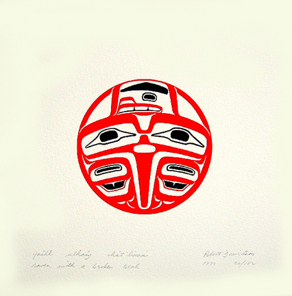 Raven with Broken Beak, subject of Haida myth, is reduced to head and wings. With the head facing front, the broken beak hangs down the center, flanked on each side by pointed wings that alamost meet at the base. A small human head at the top is a reminder that the Raven can transform into a human form.