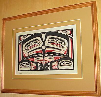 This print was developed from Davidson's 1974 Christmas card. The design was reworked and a mirror image was added making the design symmetrical. The beak runs vertically down the center while a pair of wings fold towards each other on the bottom of the print.